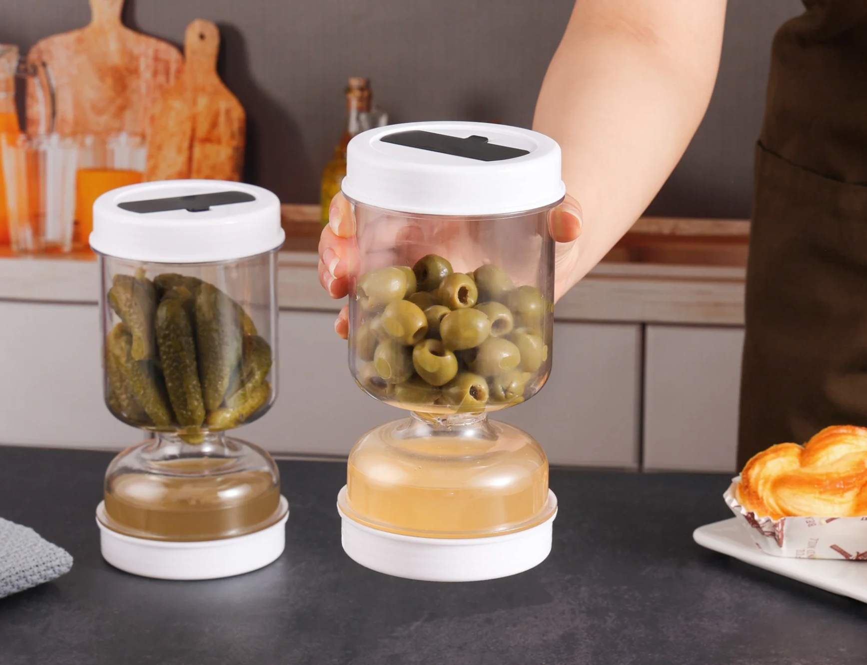 O Pote Hermético com Filtro para Azeitonas foi desenvolvido para facilitar o armazenamento e o consumo de azeitonas, picles, conservas e outros alimentos em líquidos, sem sujeira e sem desperdício.