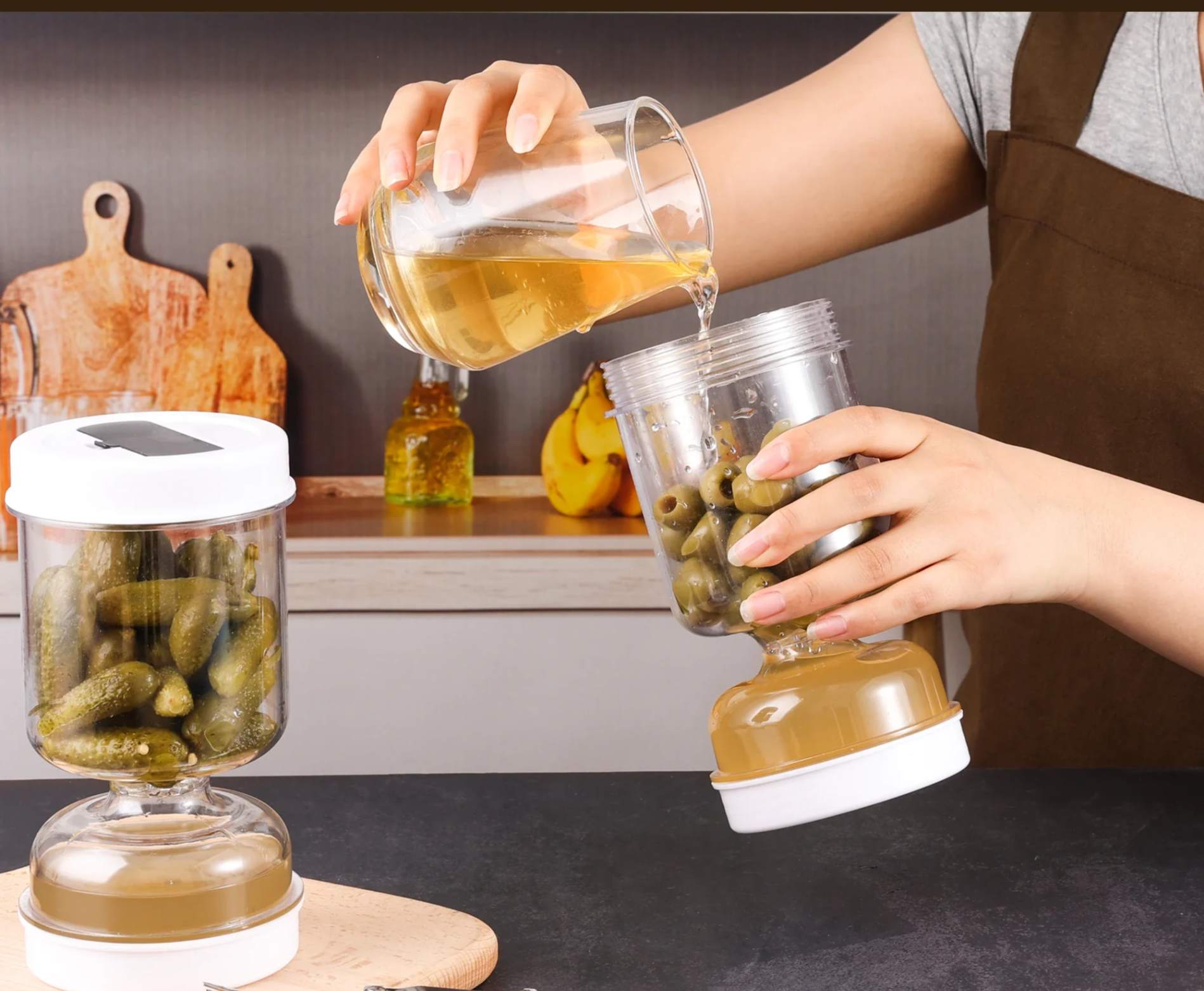 Design em ampulheta: basta virar o pote para drenar a conserva.